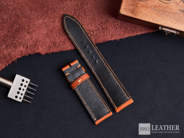 - The visible stitching contrasts subtly against the leather surface, underscoring the strap’s geometry and highlighting the required precision.