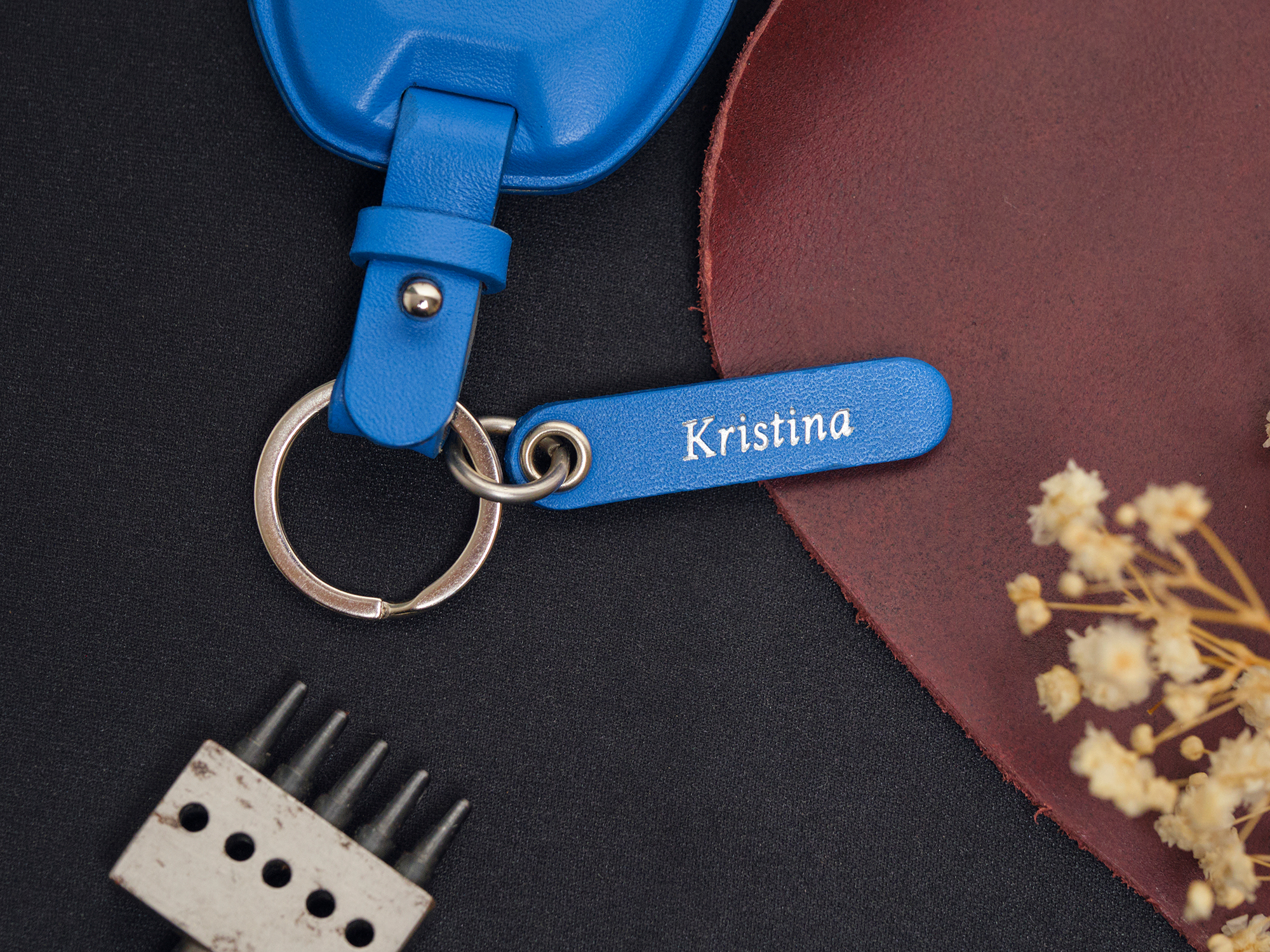 Leather tag: The tag can be engraved with a name, logo or message, adding a personalized touch. The smooth surface guarantees clear, harmonious engraving that stands out without overpowering the overall design.