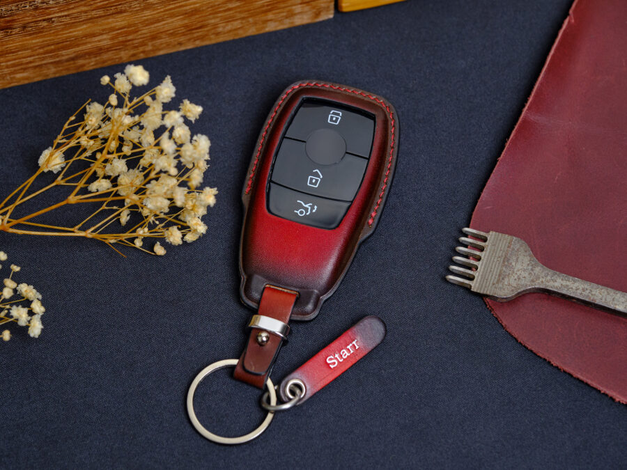 Made from high-end leather, these key fob cases exude prestige, reminiscent of the tailored interiors of the Mercedes.